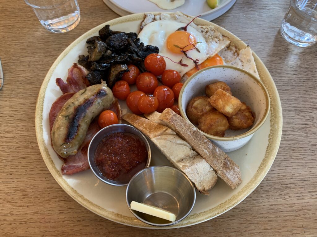 Indulge in a full English breakfast to start your day with fried eggs, fried tomatoes, fried mushrooms, bacon, sausage, toast, hash browns, and baked beans.