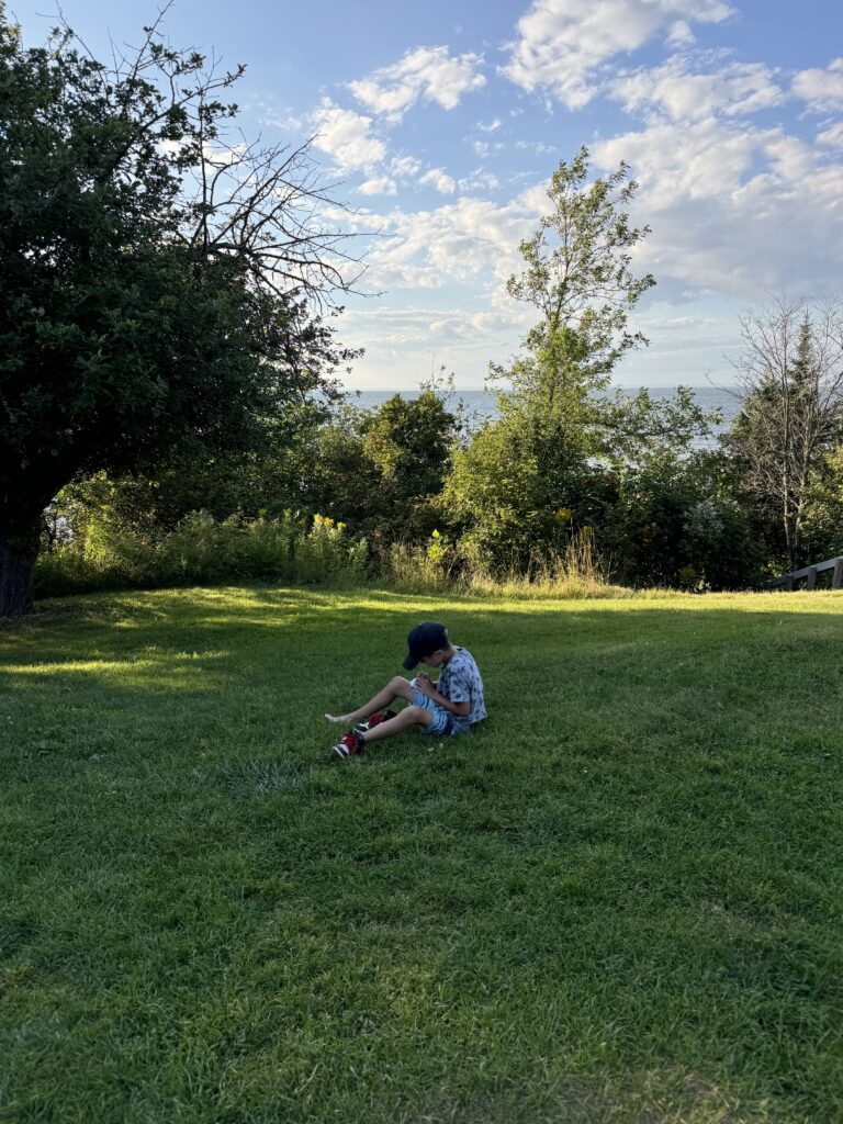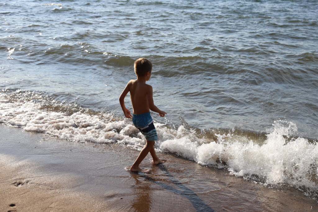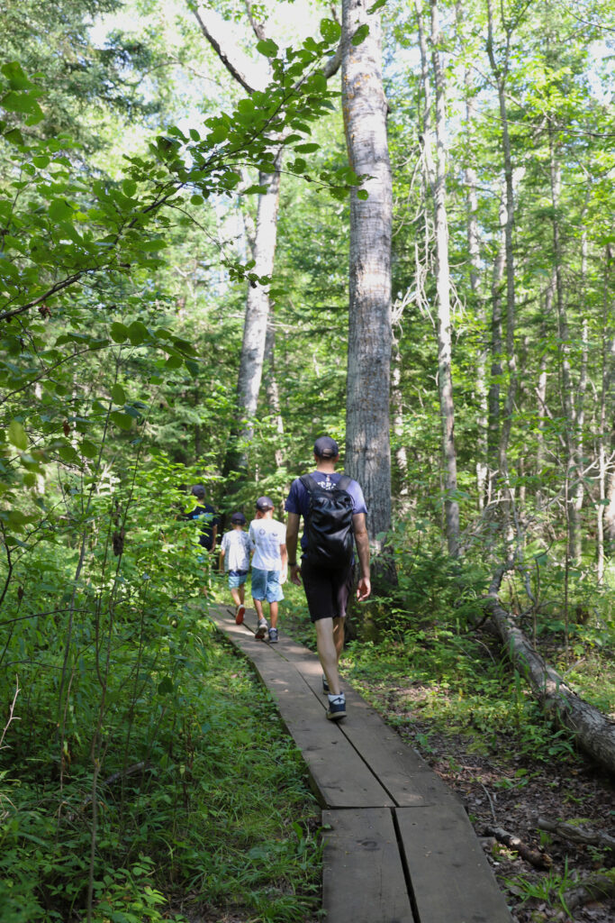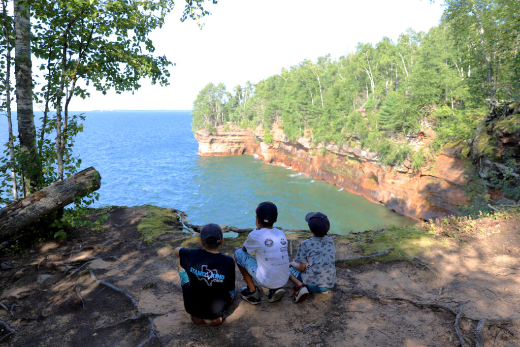 After setting up our tent at the Apostle Islands campsite, we make lunch then drive to Meyers Beach to hike the Sea Caves Trail. The scenery is gorgeous! It’s a windy day and we can hear the blue Lake Superior waves crashing into the red sandstone sea cliffs below. We snack on gorp while taking a break at “The Bowl” to enjoy the view. We hike back and play an epic game of “Would You Rather” on the way with the kids. They had the best answers that made us laugh. We visit the beach after the hike and play in the water and skip rocks. As the sun starts to set we return to our campsite, prep a fire, coals, and make dinner. We bake biscuits over the campfire and the kids fill them with Nutella, whipped cream, peanut butter, and Hershey’s chocolate. The kids LOVED them so much and say they like them even better than s’mores! We take turns telling scary stories around the campfire, and share funny camping trip memories. After staying up way too late, we clean up and get ready for bed. A great first day hiking at the Apostle Islands!